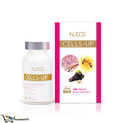 Thành phần chính của Nucos Cells-up: Collagen (nguồn gốc từ cá), Elastin, Royal Jelly Powder, Coenzyme Q10, Grape Seed Extract Powder.