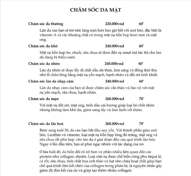 II/ Cập nhật bảng giá các dịch vụ tại Sả spa
